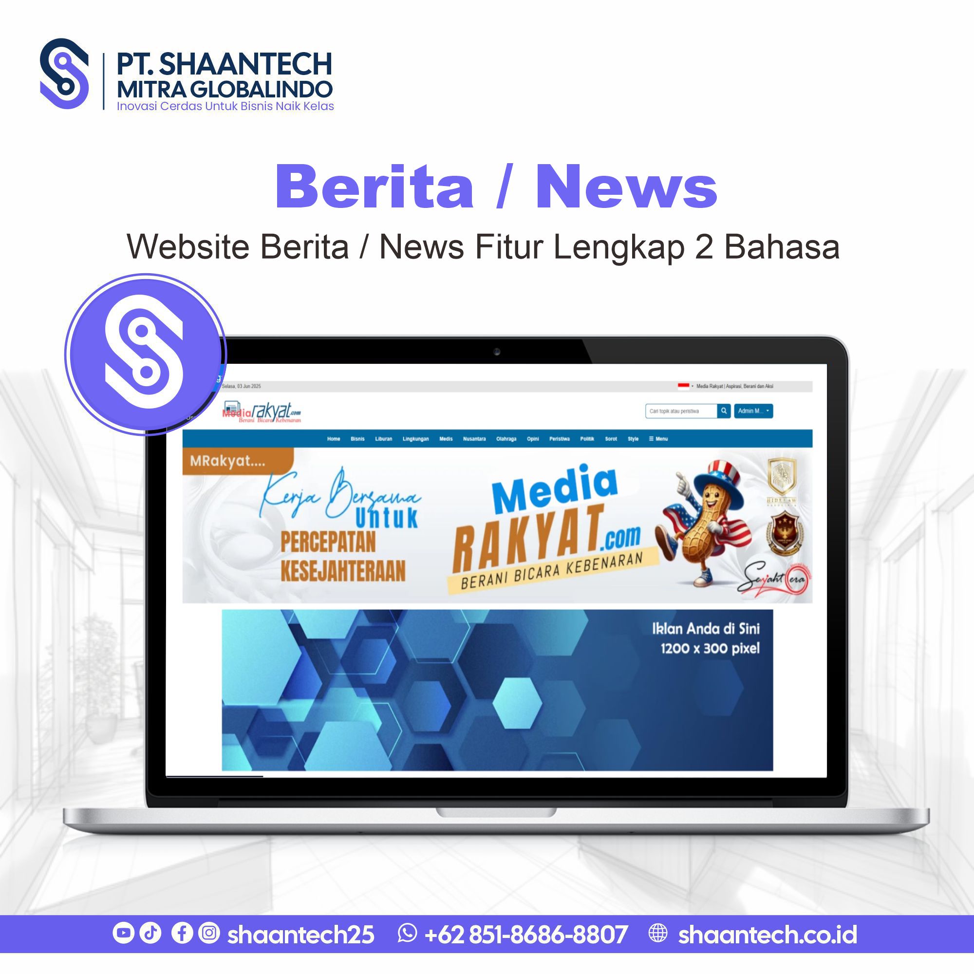 Kami spesialis dalam pembuatan Website Portal Berita / News yang modern, dinamis, dan mendukung hingga dua bahasa (Dwibahasa). Sajikan informasi relevan kepada audiens lokal dan internasional dengan mudah!